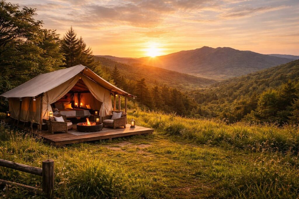 Nasze luksusowe namioty to przestrzeń, w której komfort spotyka się z prostotą. W środku znajduje się wygodne, pełnowymiarowe łóżko z wysokiej jakości pościelą, nastrojowe oświetlenie oraz strefa wypoczynkowa, która zachęca do zwolnienia tempa. To miejsce stworzone do porannej kawy w ciszy, popołudniowej drzemki i wieczorów spędzonych przy spokojnej rozmowie.
